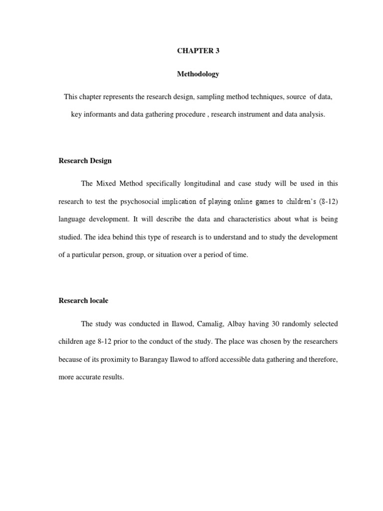 This example is written in past tense but should be written in future tense for the concept and proposal. It starts with a description of the research design, followed by the research method, and ends with an outline of the statistical techniques used to address issues of validity and reliability of the instruments used for the collection of data. It provides information concerning the method that was used in undertaking this research as well as a justification for the use of this method. Chapter 3 research methodology • research design • respondents of the study • research instrument • data gathering procedure • treatment of data 2. In developing the chapter three of the research project, you state the purpose of research, research method you wish to adopt, the instruments to be used, where you will collect your data.